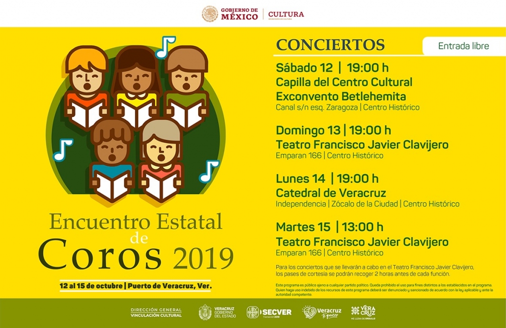 El Instituto Veracruzano de la Cultura (IVEC), a través de la Subdirección de Educación e Investigación Artística, realizará el Encuentro Estatal de Coros 2019, del 12 al 15 de octubre, a partir de las 19:00 horas y con entrada libre en el Exconvento Betlehemita, el Teatro Francisco Javier Clavijero y la Catedral de Veracruz.