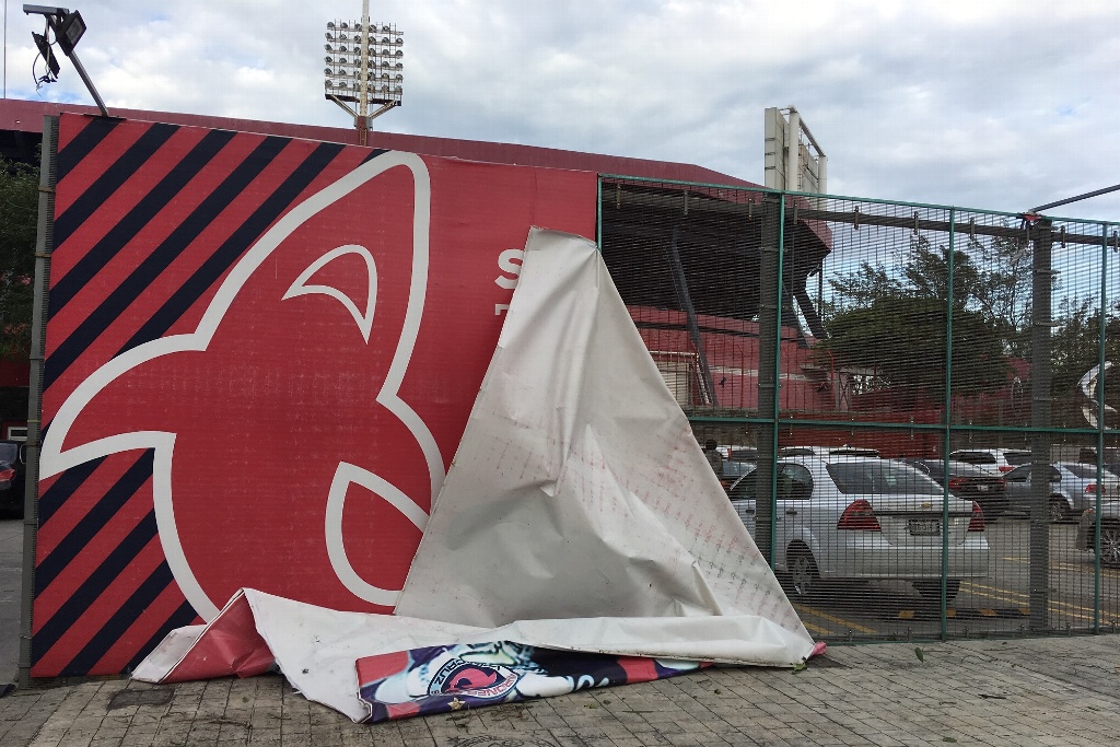 La publicidad que cuelga de forma vertical en la cara externa del estadio también mostraba afectaciones desprendiéndose de las cuerdas que la sujetan.