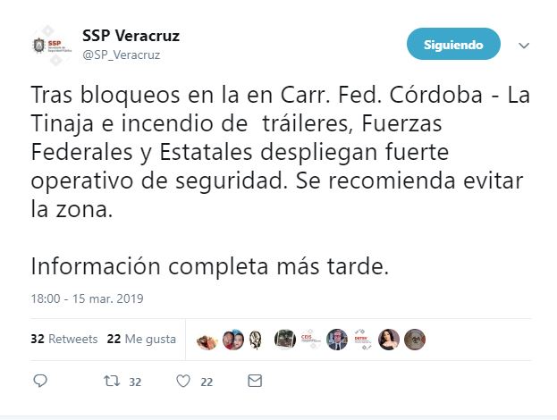 “Tras bloqueos en la en carretera Córdoba-La Tinaja e incendio de tráileres, Fuerzas federales y estatales despliegan fuerte operativo de seguridad. Se recomienda evitar la zona”