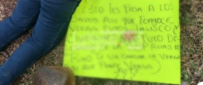 El cuerpo estaba boca abajo y con los ojos vendados, con signos de tortura y lesiones producidas por armas de fuego, también le fue colocada una cartulina con un narcomensaje firmado por un grupo de la delincuencia organizada.