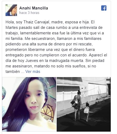 “Hola, soy Thaiz Carvajal, madre, esposa e hija. El Martes pasado salí de casa rumbo a una entrevista de trabajo, lamentablemente esa fue la última vez que vi a mi familia. Me secuestraron, llamaron a mis familiares pidiendo una alta suma de dinero por mi rescate, prometieron liberarme una vez que el dinero fuera entregado pero no cumplieron con el acuerdo. Aparecí el día de hoy Jueves en la madrugada muerta. Sin piedad me asesinaron, matando no solo mis sueños, si no también la paz y tranquilidad de mi familia, dejando a mi hija sin su madre para siempre... ¿Que hice mal? Nada, lo único que hice mal fue haber asistido a una entrevista de trabajo.