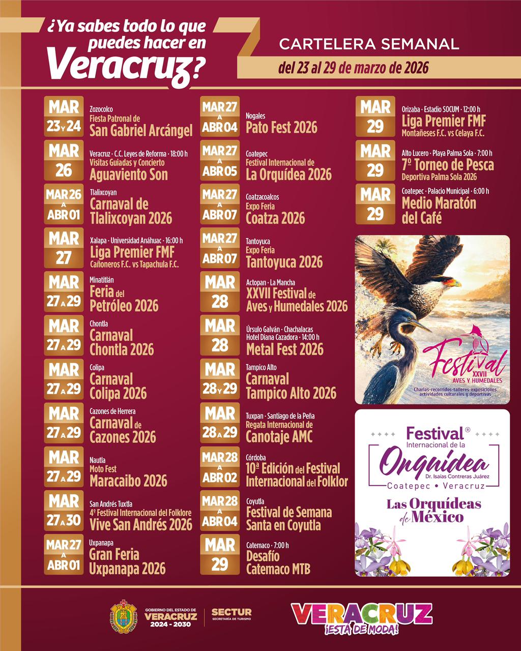 La Secretaría de Turismo (SECTUR) invita a disfrutar de la agenda de actividades que se llevarán a cabo del 26 al 29 de marzo en distintos municipios de Veracruz, con una amplia oferta de eventos culturales, deportivos, gastronómicos y tradicionales.